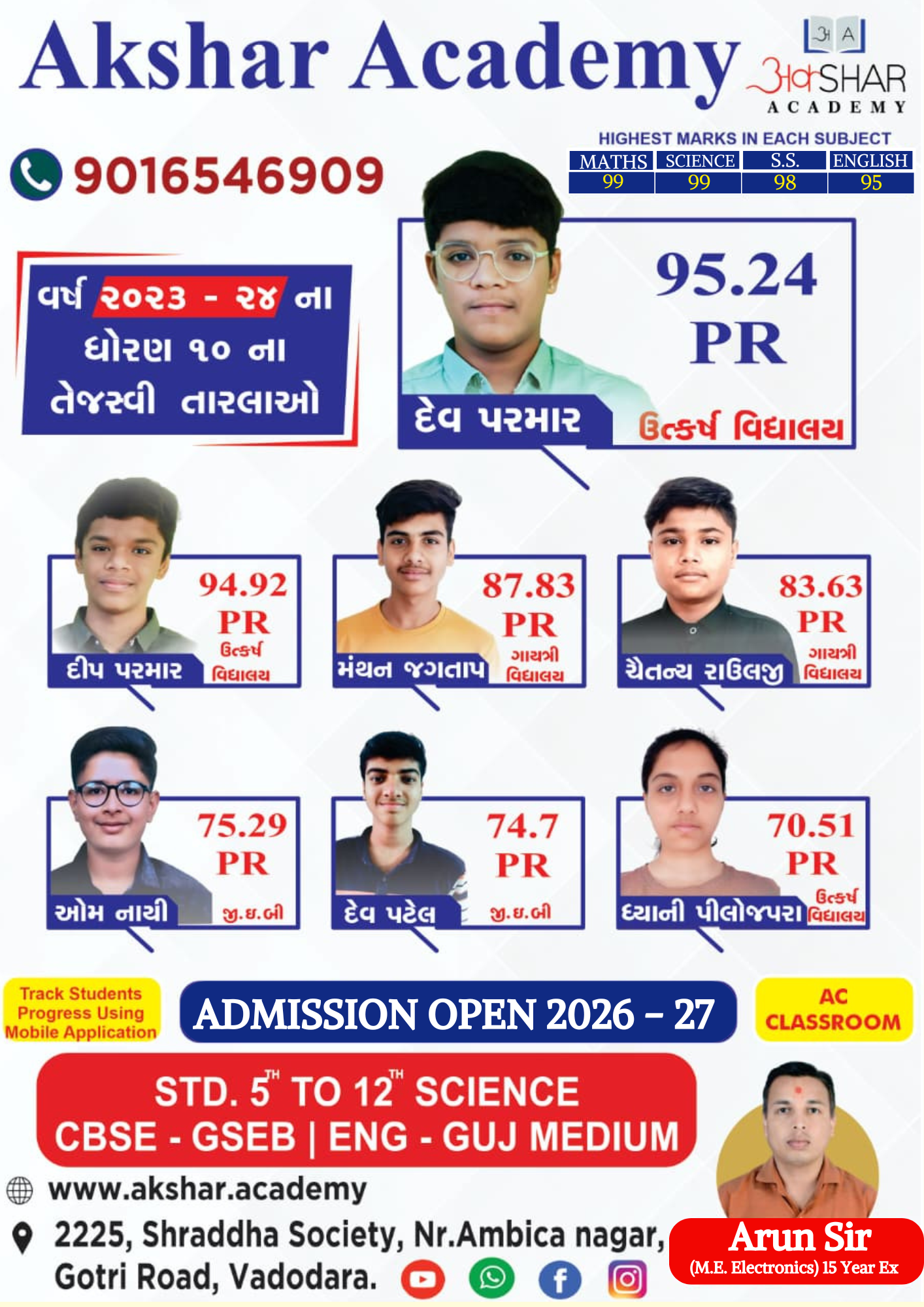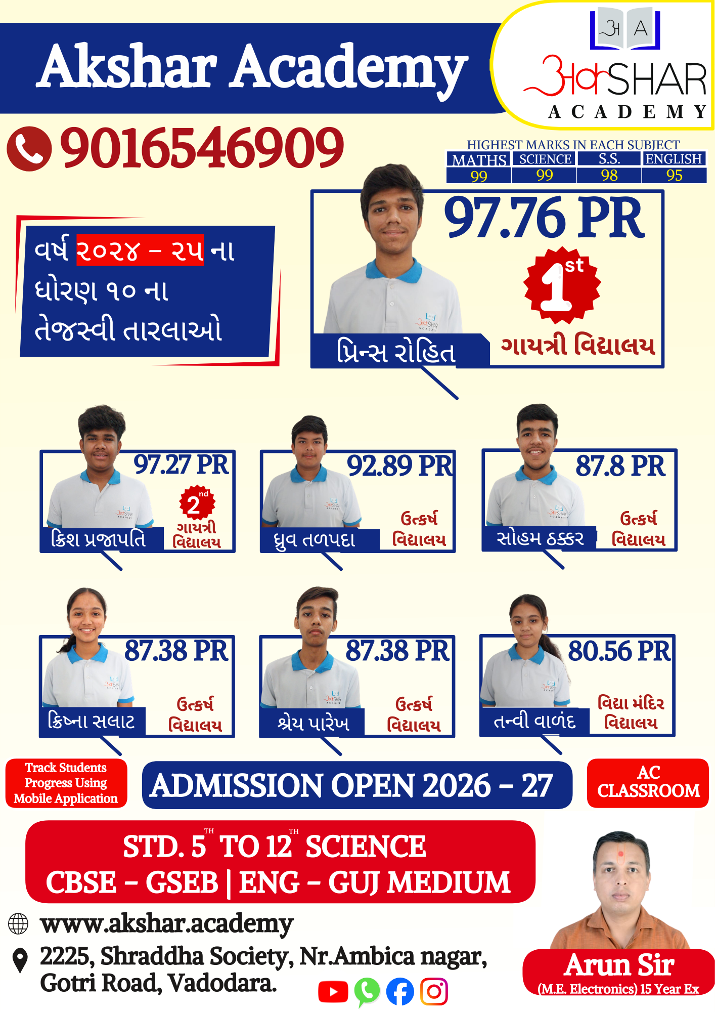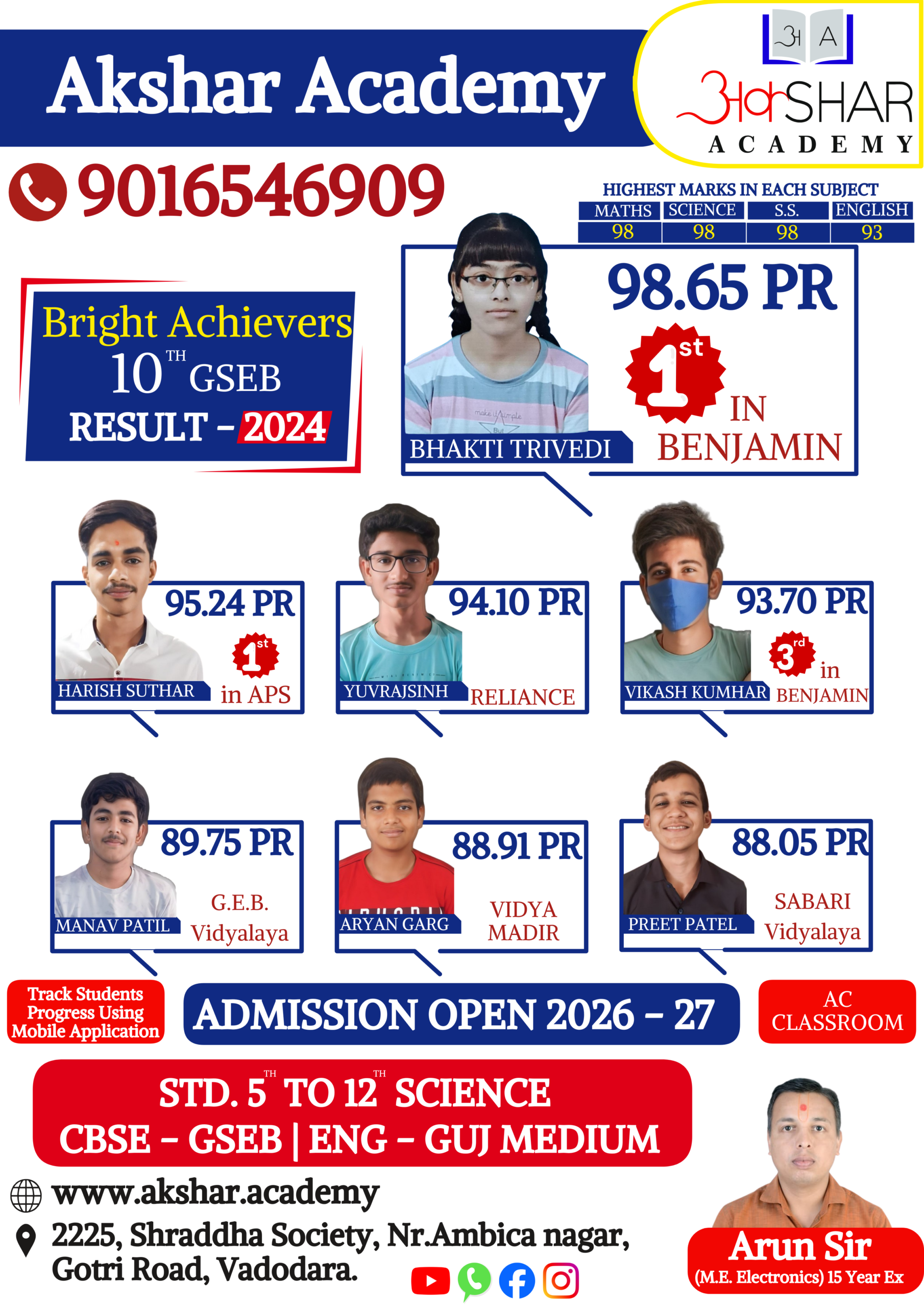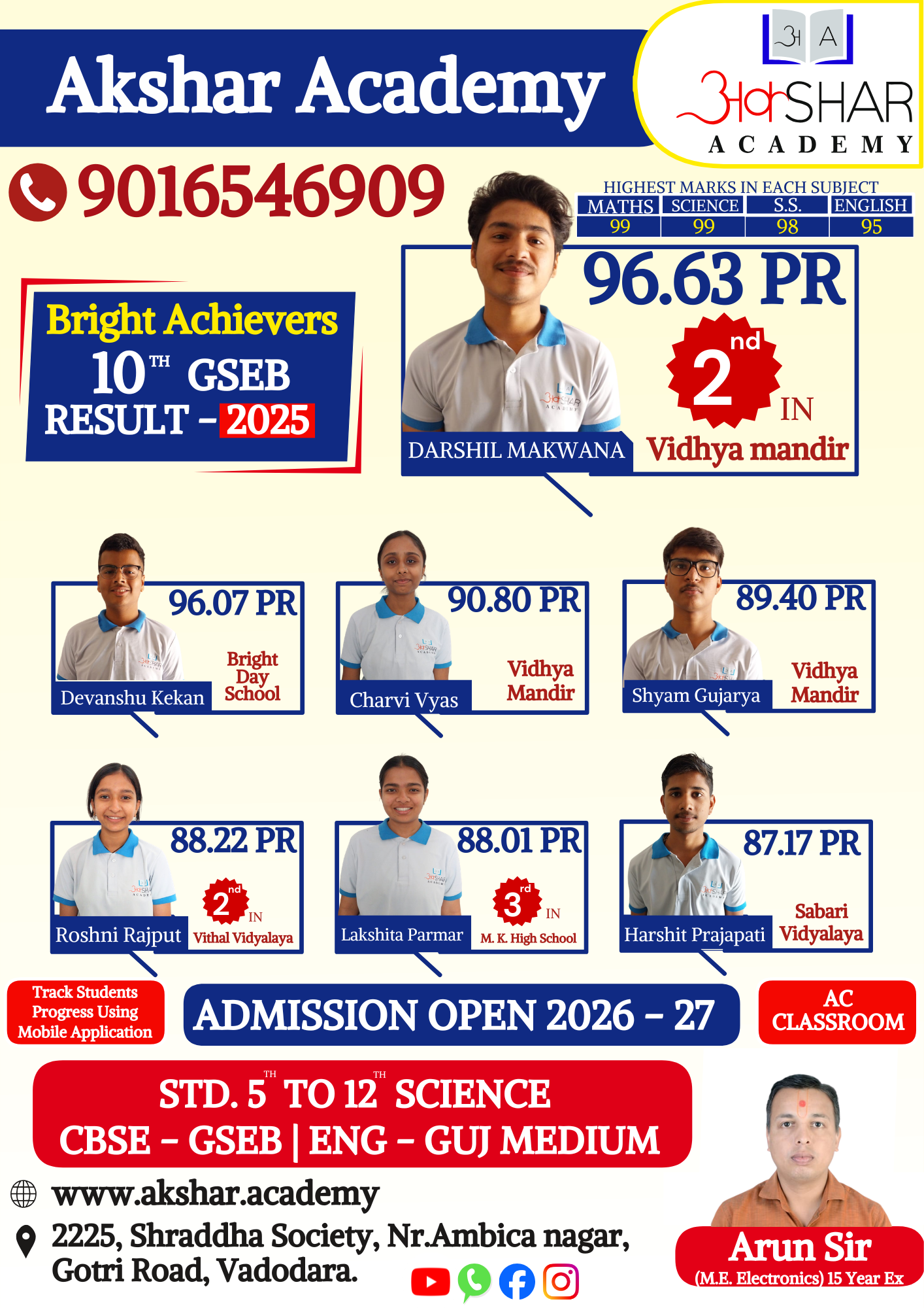 Welcome to Akshar Academy by Arun Sir, a dedicated institute committed to delivering quality education for students from Std. 5 to 12 under both CBSE and GSEB boards, in English and Gujarati mediums.